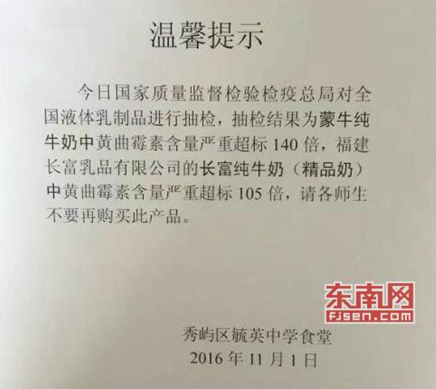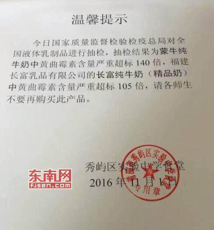 落款为秀屿区实验中学食堂的温馨提示 落款为秀屿区毓英中学食堂的温馨提示 东南网莆田11月1日讯(本网记者 柳烨)“今日国家质量监督检验检疫总局对全国液体乳制品进行抽检,抽检结果为蒙牛纯牛奶中黄曲霉素含量严重超标140倍,福建长富乳品有限公司的长富纯牛奶(精品奶)中黄曲霉素含量严重超标105倍,请各师生不要再购买此产品。”11月1日,网上流传出一份落款为“秀屿区实验中学食堂”的温馨提示,落款处还盖有“莆田市秀屿区实验中学食堂专用章”的印章。东南网“网络求真”栏目接到网友反映后第一时间了解到,该温馨提示或系谣言。