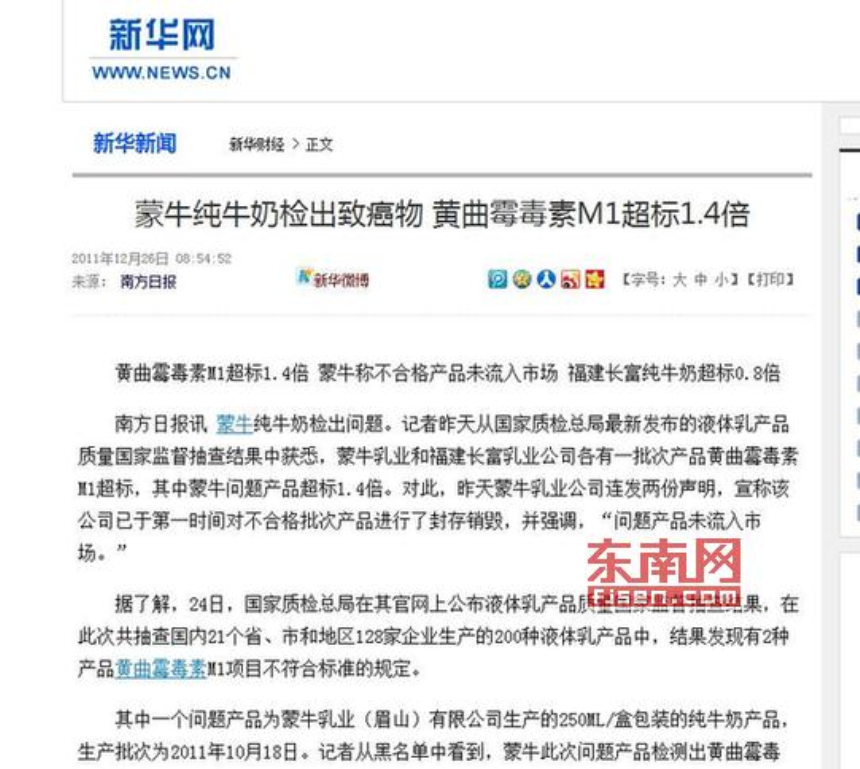 东南网记者浏览国家质量监督检验检疫总局官网,并未发现今日(11月1日),国家质量监督检验检疫总局有发布相关“全国液体乳制品抽检”信息。但记者通过网上搜索发现,2011年12月,国家质检总局曾公布了一份对200种液体乳产品质量的抽查结果。抽查发现蒙牛、长富纯2种产品黄曲霉毒素M1项目不符合标准的规定。