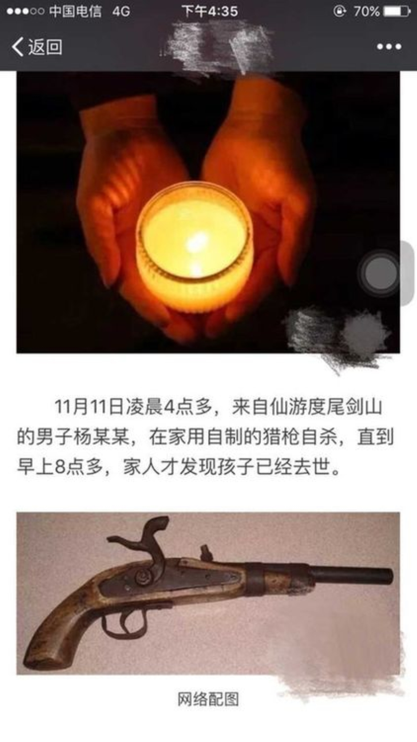 根据网帖爆料,当天凌晨4点多,仙游度尾一男子在家用自制的猎枪自杀,直到早上8点多,家人才发现杨某已经去世。