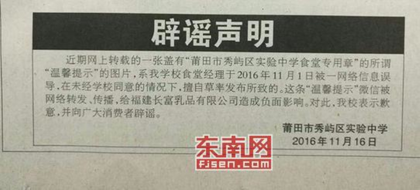 “当时,那份‘温馨提示’并未在学校(秀屿区实验中学)内部张贴,但却被学校总务处相关责任人的亲属通过微信误发,并无主观恶意影响企业声誉。”秀屿区教育局工作人员表示,经与福建长富牛奶乳品有限公司沟通后,学校刊登了这则辟谣声明。