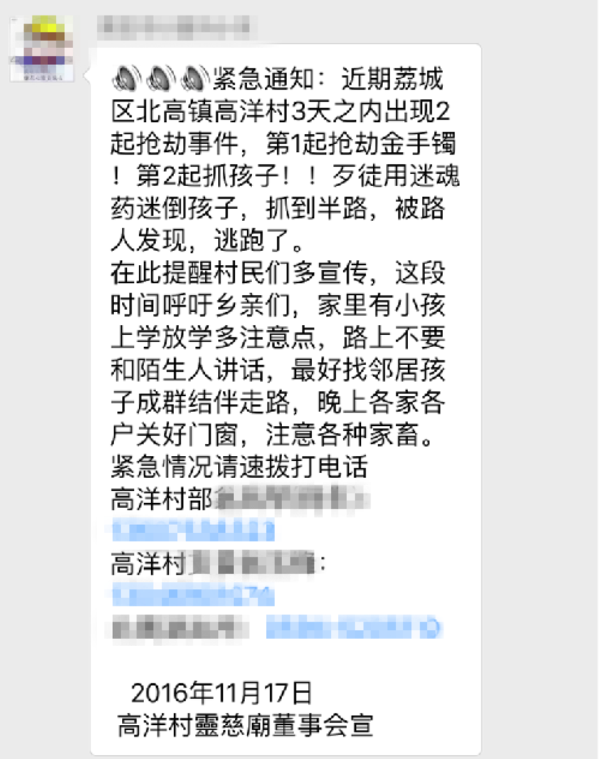 东南网莆田11月19日讯(本网记者 柳烨)昨日,有网友向东南网“网络求真”栏目反映,称微信朋友圈流传一份“紧急通知”,称“近期荔城区北高镇高洋村3天之内出现2起抢劫事件,第1起抢劫金手镯!第2起抓孩子!”对此,警方表示,并没有接到村民报警“抢小孩”的警情。