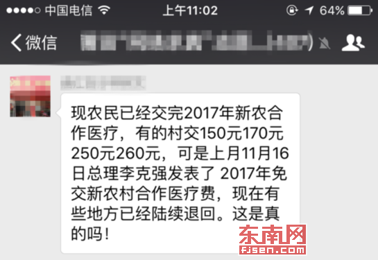 东南网莆田12月28日讯(本网记者 柳烨)日前,有网友向东南网“网络求真”栏目反映,称近期网传2017年免交新农村合作医疗费,真的吗?对此,莆田市卫计委工作人员表示,该信息系谣言。 该消息表示,“现农民已经交完2017年新农合作医疗,有的村交150元170元250元260元,可是上月11月16日总理李克强发表了2017年免交新农村合作医疗费,现在有些地方已经陆续退回。”