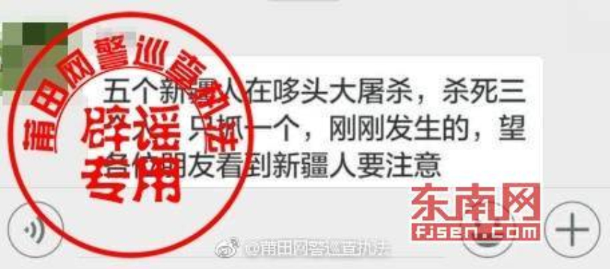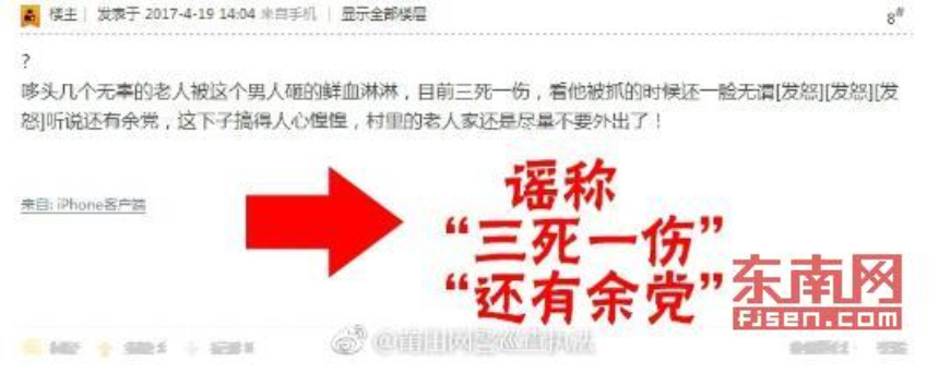 此外,东南网记者从莆田市公安局公共信息网络安全监察支队获悉,目前,网络上关于此案的已有数个版本的谣言在传播:有说是“新疆人”作案的;有说是为了抢老人金子作案的;还有一个自称是“当地人士”,图文并茂地讲述了一个“恐怖分子为了抢小孩,用石砖砸了4个人,三死一伤,有人连脑浆都被砸出来了,还有余党在逃”的惊险“故事”,并信誓旦旦地表示“不是谣言”。