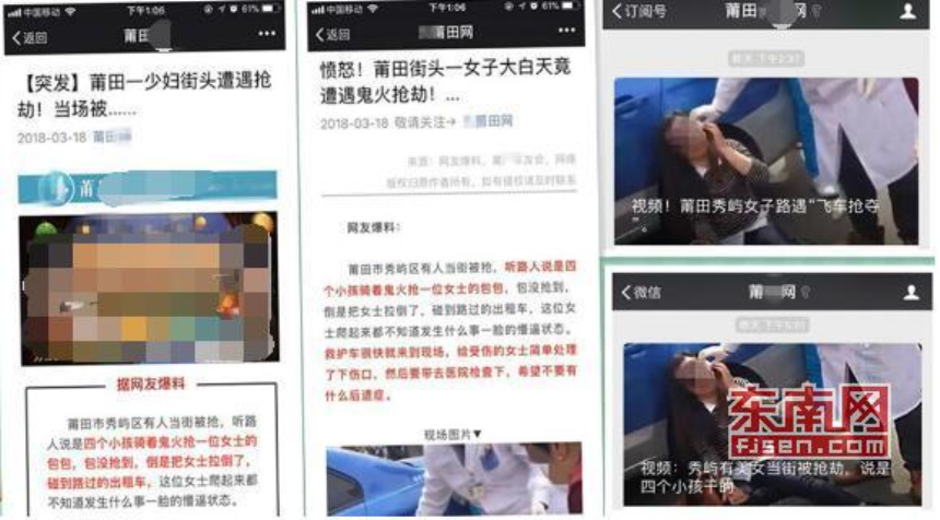 东南网莆田3月19日讯(本网记者 王龙风)18日,莆田多个自媒体号发布一条消息,称秀屿区一名女子遭遇“飞车抢夺”受伤。东南网“网络求真”栏目记者从秀屿公安分局获悉,该事系一起交通事故,并非“飞车抢夺”。 记者从网上流传的视频看到,一名女子受伤倚靠着一辆出租车坐在地上,一名医生正为其处理伤口。有围观人群称,该女子走路时被四个年轻人骑车抢劫。昨日,莆田多个自媒体号便将此事冠以标题“莆田一少妇街头遭遇抢劫!当场被……”“莆田秀屿女子路遇飞车抢夺”“莆田街头一女子大白天竟遭遇鬼火抢劫”等进行传播。