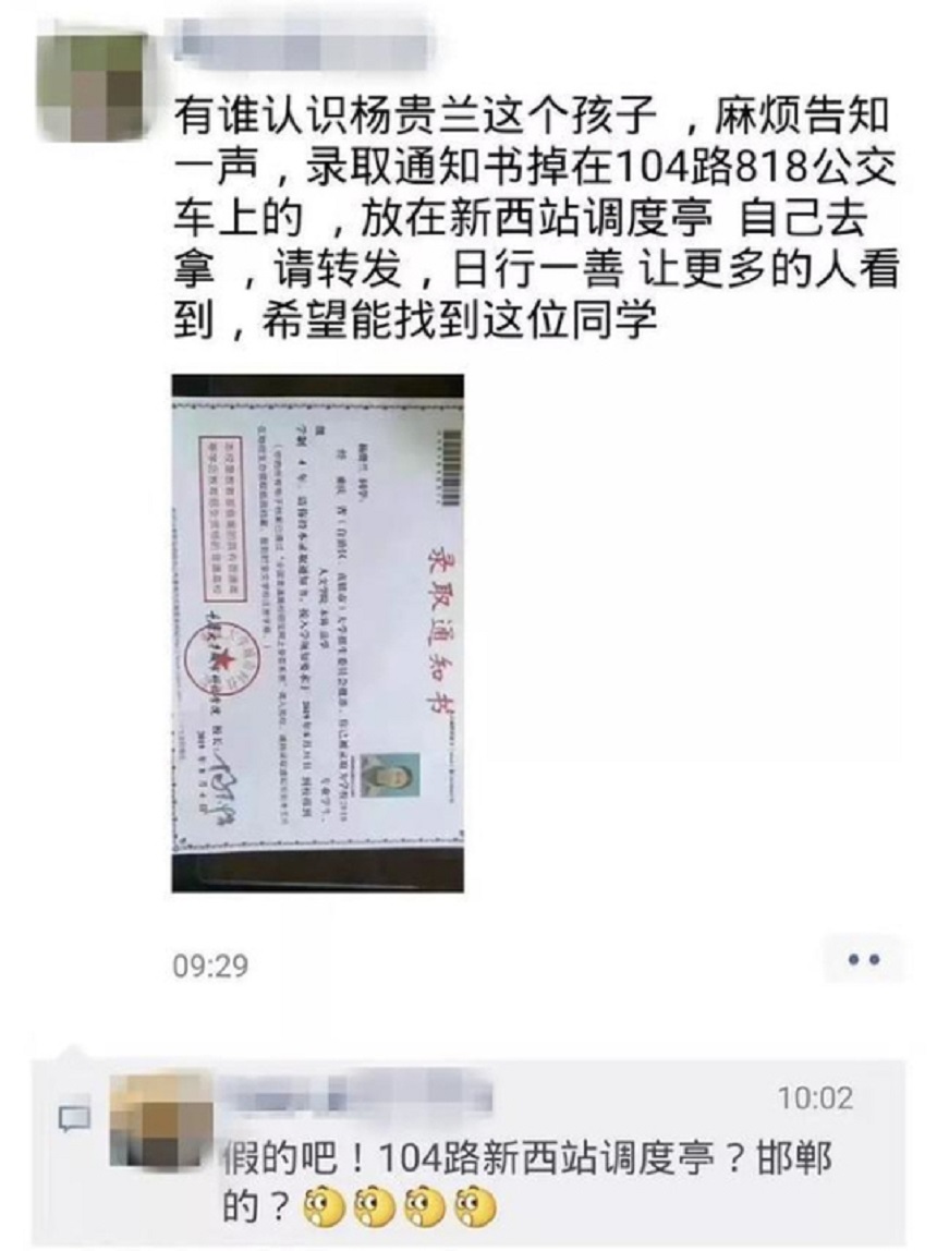 东南网莆田8月18日讯(本网记者 杨超斌)“杨贵兰的录取通知书遗失在104路8181公交车上,现放在新西站调度亭里,请帮忙转发……”近日,莆田市民的朋友圈被这则失物招领刷屏。东南网记者进一步了解到,该事件发生在重庆,且杨贵兰于8月9日当天下午已找回录取通知书。 接到网友反映后,东南网“网络求真”栏目记者立即联系莆田市公交公司了解到,莆田没有104路公交车,事发地不在莆田。随后,记者从重庆大学城市科技学院公众号处了解到事情的详情。据介绍,8月9日上午,网络上出现一则“杨贵兰同学,你的录取通知书掉了”的信息,引起了广大网友的关注和转发。在广大网友的帮助下,不到两个小时,该同学就已找到并取回录取通知书。 |
