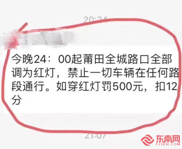 东南网莆田2月6日讯(本网记者 吴炳端)“今晚24时,莆田市全城路口全部调为红灯,禁止一切车辆在任何路段通行,如闯红灯罚500元,扣12分。”今晚,这则消息在莆田本地各微信群流传。东南网“网络求真”记者从莆田市公安局交警支队了解到,红绿灯未调整,是谣言!